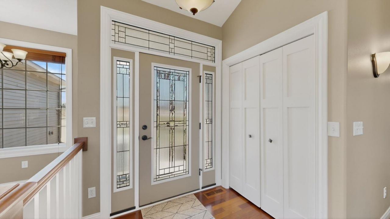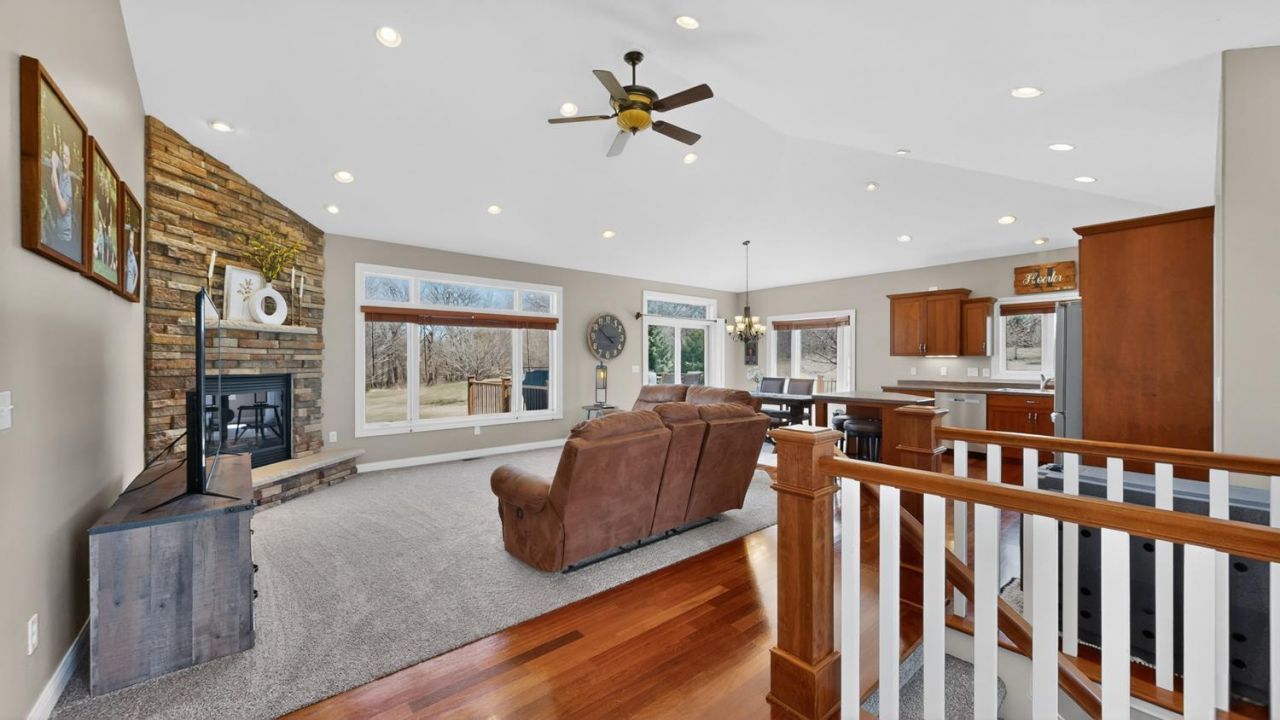 Gorgeous 5 bedroom, 3 bath home offering convenient main floor living and exceptional craftsmanship throughout. The main level features 9 foot ceilings, custom trim work, Andersen windows, and rich cherry hardwood floors. Enjoy an open concept layout with abundant natural light, highlighted by a stunning kitchen with vaulted ceilings, a large center island, and seamless flow into the living room, complete with a beautiful stone fireplace. The main floor includes three spacious bedrooms, including a private primary suite with a walk-in closet and ¾ bath. A large mudroom with laundry and utility sink is conveniently located just off the garage. The walkout lower level expands your living space with a huge family room, recreation room, bonus room, two additional bedrooms, and a full bath perfect for entertaining or guests. Situated on a beautifully landscaped 1.28 acre lot, the outdoor space features a deck and stamped concrete patio, offering plenty of room to relax and enjoy the surroundings.