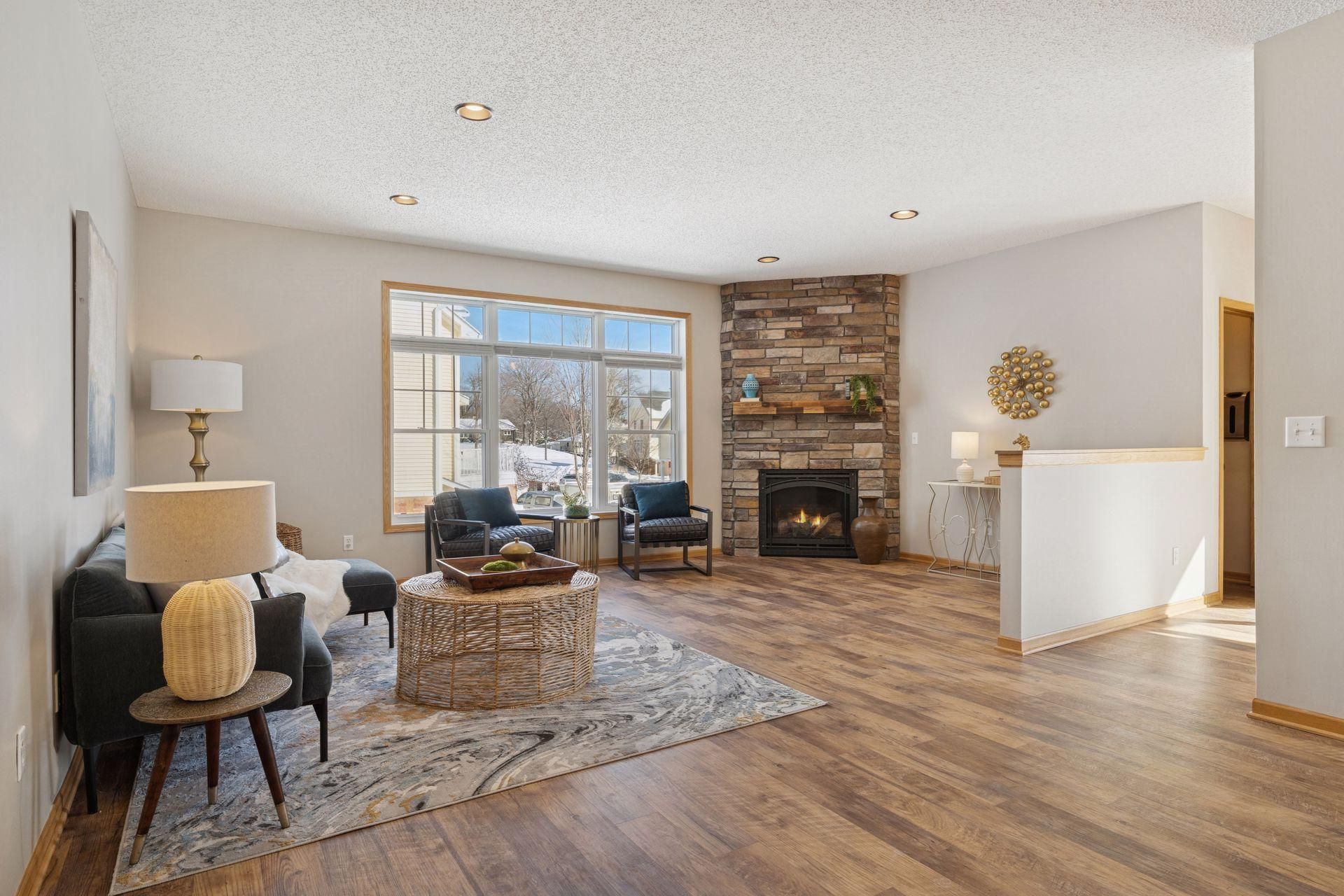This beautifully maintained 3-bedroom, 2-bath end-unit townhome is now available in the highly sought-after Village Trail neighborhood. Soaring ceilings and an open-concept design create a bright, spacious atmosphere throughout the home. A stunning floor-to-ceiling brick gas fireplace anchors the main living area, adding warmth and custom character.The kitchen has been thoughtfully updated with Cambria countertops and a custom tile backsplash, while all kitchen and laundry appliances were replaced in 2024. Major mechanical updates include a new water heater and air conditioner in 2022, offering peace of mind for years to come. Owners installed all new LVP flooring in 2023. Oversized windows fill the home with natural light, seamlessly connecting indoor comfort with the surrounding landscape.Freshly painted with professionally cleaned carpets prior to listing, this home is truly move-in ready and easy to show. The attached two-car garage provides ample storage for seasonal gear and recreational equipment. One of the home's standout features is the private three-season porch with retractable vinyl windows, a cherished retreat overlooking the neighborhood walking path with direct access to the Dakota Rail Regional Trail.Ideally located in the heart of Mound, you'll be just steps from the future city library, local shops, restaurants, parks, trails, the ice rink, and the scenic shores of Lake Minnetonka.